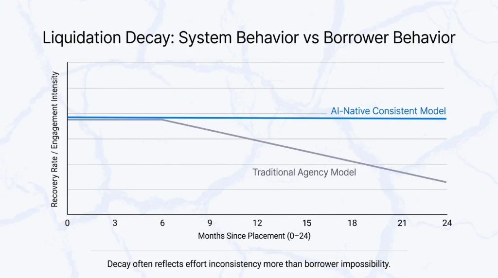 Traditional agency models often deprioritize accounts after six to ten months. Attention shifts to newer placements, outreach becomes less consistent, and performance declines. This drop is often attributed to borrower exhaustion.