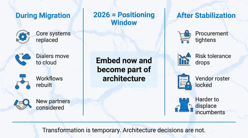 Institutions described long migration timelines that restrict vendor intake. Dialer and contact infrastructure is being rebuilt, sometimes from scratch. Onboarding workflows remain tightly coupled to legacy systems, which makes change sensitive.